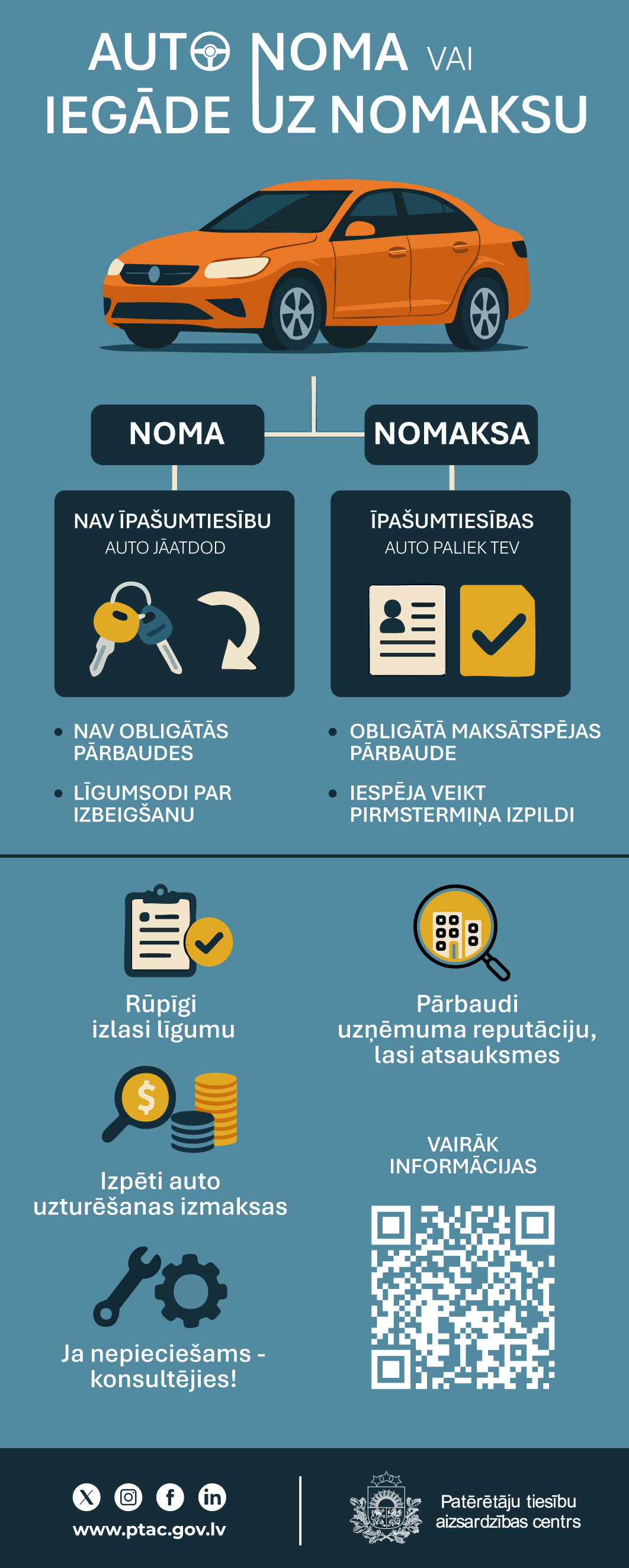 Finanšu pratības nedēļā Patērētāju tiesību aizsardzības centrs (PTAC) aicina patērētājus īpaši rūpīgi izvērtēt lēmumus, kas saistīti ar ilgtermiņa finanšu saistībām. Viens no tiem ir automašīnas izvēle – vai priekšroku dot ilgtermiņa auto nomai vai iegādei uz nomaksu (kredītā vai līzingā).