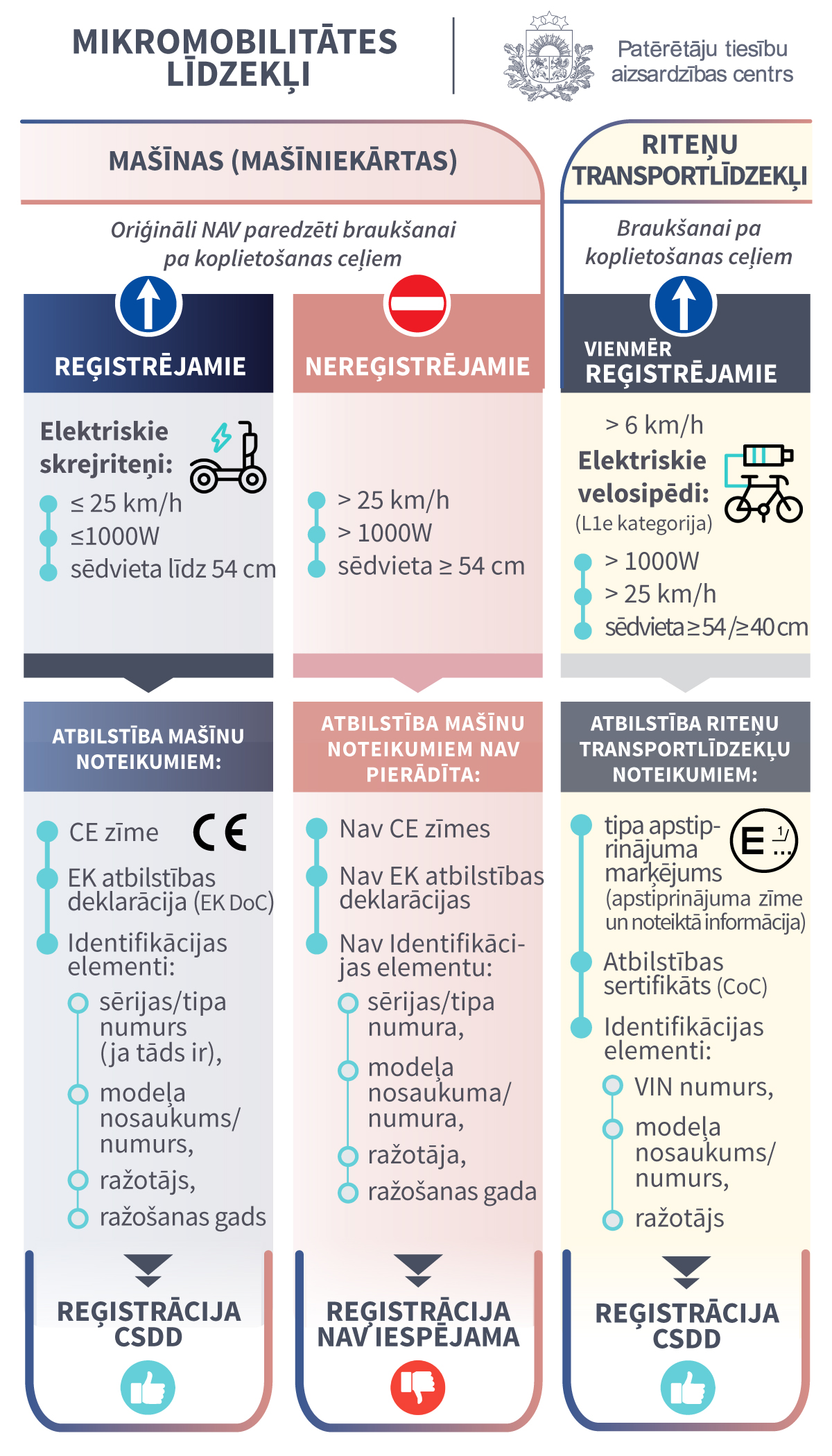 PTAC aicina patērētājus būt vērīgiem un iegādāties tādus mikromobilitātes līdzekļus, kas atbilst visām prasībām, lai tos reģistrētu CSDD. Jāņem vērā, ka tirgū ir pieejami arī tādi mikromobilitātes līdzekļi, kuru tehniskie parametri ir reģistrācijai neatbilstoši, tāpēc pirms iegādes pievērsiet uzmanību to ātruma, jaudas un sēdvietas augstuma parametriem, CE zīmes vai tipa apstiprinājuma marķējuma un atbilstības deklarācijas vai sertifikāta esamībai, kā arī identifikācijas elementiem.