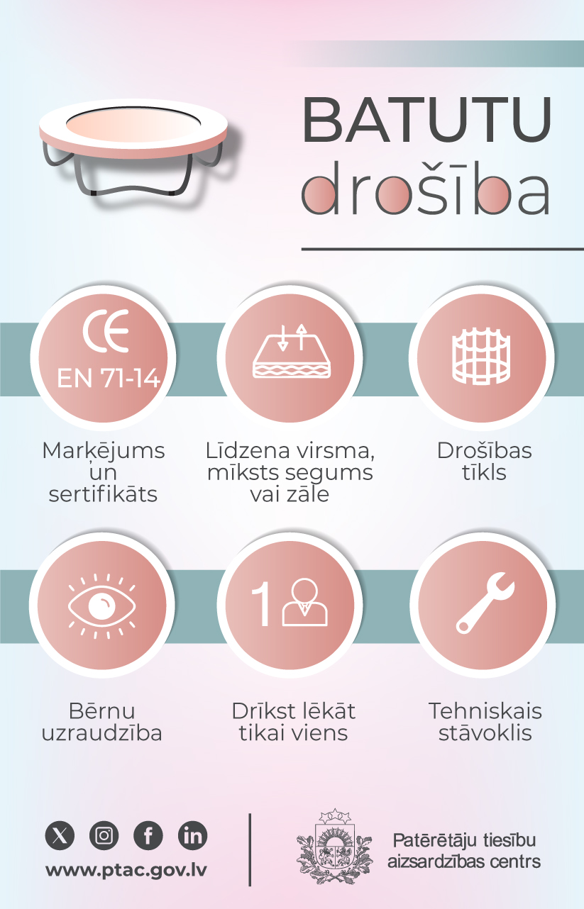 Iestājoties siltākam laikam, arvien vairāk bērnu brīvo laiku pavada ārā, tostarp izmanto iespēju izmantot batutus un piepūšamās atrakcijas. Patērētāju tiesību aizsardzības centrs (PTAC) atgādina – lai prieks par aktīvām nodarbēm nebeigtos ar traumām, ir svarīgi ievērot drošības noteikumus.