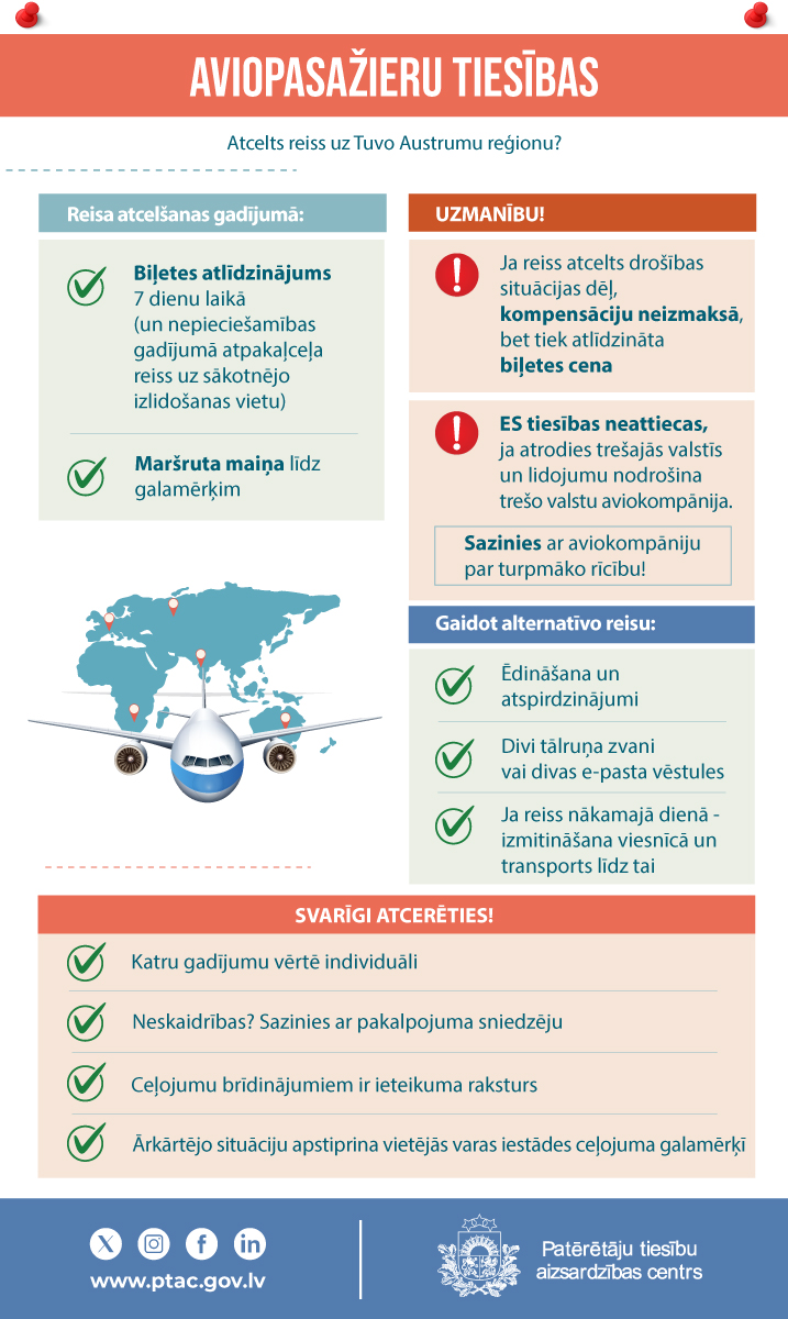 (!) PTAC aicina pasažierus vispirms sazināties ar konkrēto aviokompāniju un sekot informācijai tās oficiālajos saziņas kanālos.