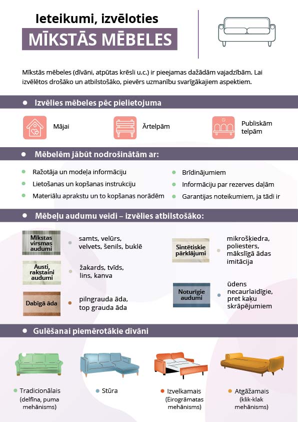 Mīkstās mēbeles ( piemēram, dīvāni, atpūtas krēsli u.c.) ir pieejamas dažādām vajadzībām. Lai atbilstoši savam dzīvesveidam un reālajām vajadzībām pārdomāti izvēlētos ērtāko, drošāko un atbilstošāko, pievērsiet uzmanību kādam mērķim un pielietojumam mīksto mēbeli paredzēts iegādāties, t.i. sēdēšanai, gulēšanai vai kombinētai izmantošanai. Informējiet par to ražotāju, pārdevēju.