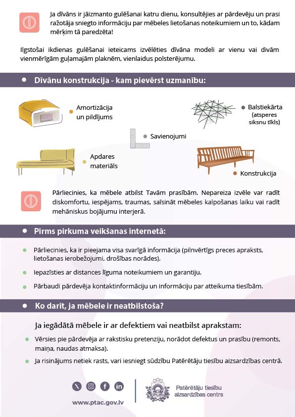 Mīkstās mēbeles ir neatņemama mājokļa, biroja un publisko telpu sastāvdaļa. Parasti mājsaimniecībā mēbeles ir investīcija uz 7 līdz 10 gadiem, tomēr ņemot vērā tirgus pieprasījumu pēc demokrātiskākām cenām, dažkārt tiek pielietoti izejmateriāli, kas nekalpo ilgāk par 5 gadiem. Pirms mīksto mēbeļu individuāla pasūtījuma vai pirkuma veikalā veikšanas, lai tās kalpotu ilgi, būtu drošas un ērti lietojamas Patērētāju tiesību aizsardzības centrs (PTAC) sadarbībā ar Mēbeļu ražotāju asociāciju Latvijā un nozares ekspertiem aicina patērētājus pārliecināties, vai tās atbilst prasībām un iesaka izvērtēt vairākus aspektus pirms.
