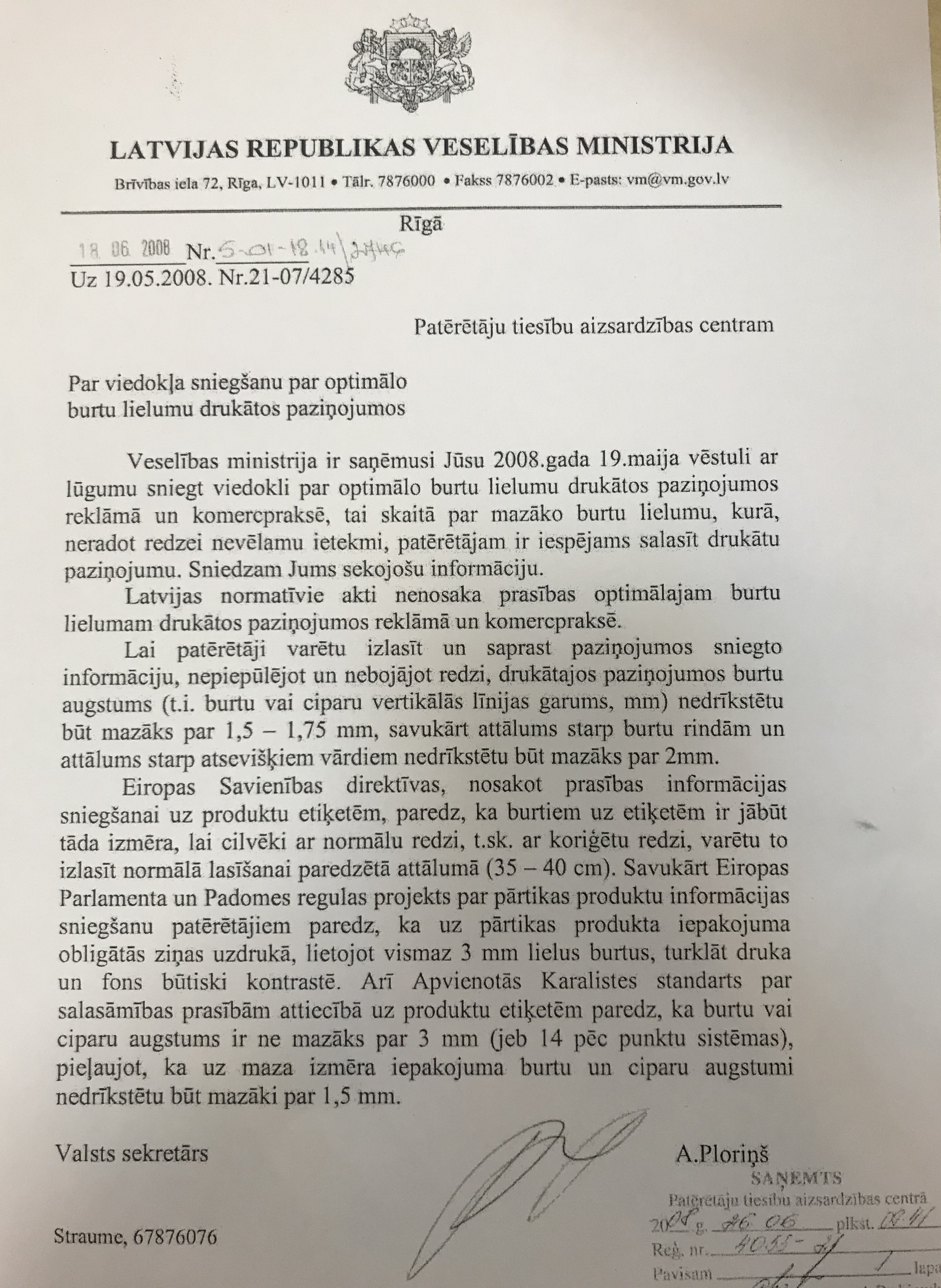 Tā kā Latvijas normatīvie akti nenosaka prasības optimālajam burtu lielumam drukātajos paziņojumos un reklāmā. Patērētāju tiesību aizsardzības centrs lūdzis Veselības ministrijas viedokli šajā jautājumā, no cilvēka veselības perspektīvas.